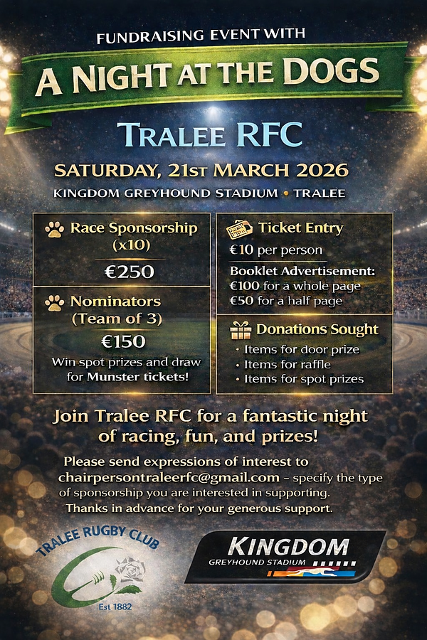 Get ready for a night of fast dogs, great craic, and even better company at Tralee RFCβs Night at the Dogs! ππ»